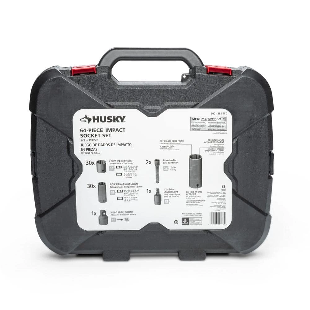 This is Husky’s most complete and widest selection of 1/2 in. drive Impact Sockets in 1 set all conveniently stored in single, easy to transport case. The 6-point style of socket helps to reduce the chance of rounding fasteners under high-torque applications and feature chamfered lead-ins for quick and easy placement onto fasteners. The industrial grade black oxide finish provides added durability and prevents corrosion.