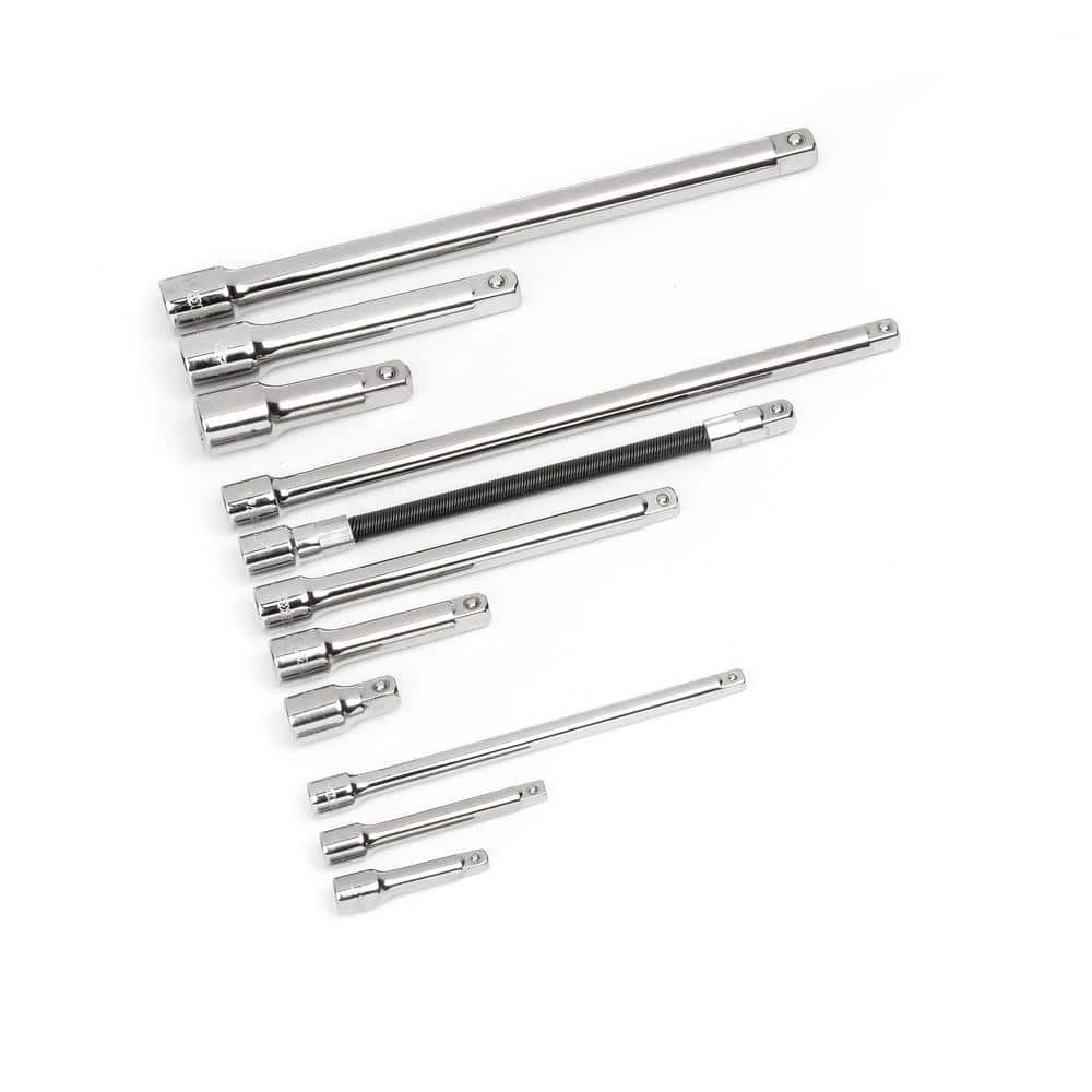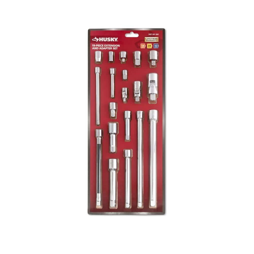 The Husky 19-piece complete Accessory Set includes a variety of extensions, adapters and universal joints that are made from alloy steel for strength and long-lasting performance. The finish provides resistance to corrosion. The chamfered lead-in on both ends allows for quick and easy attachment to the drive tools and sockets. Set includes: 9 standard extensions- 1/4 in. drive (3, 6 in.) 3/8 in. drive ( 1-1/2, 3, 6, 10 in.) 1/2 in. drive ( 3 in., 5 in., 10 in.), one 3/8 in. drive 8 in. flex extension, 4 drive adapters (1/4F to 3/8M, 3/8F to 1/4M, 3/8F to 1/2M and 1/2F to 3/8M), 3 universal joints (1/4, 3/8, 1/2 in.) and 2 bit adapter sockets (1/4 in. and 3/8 in. drive).