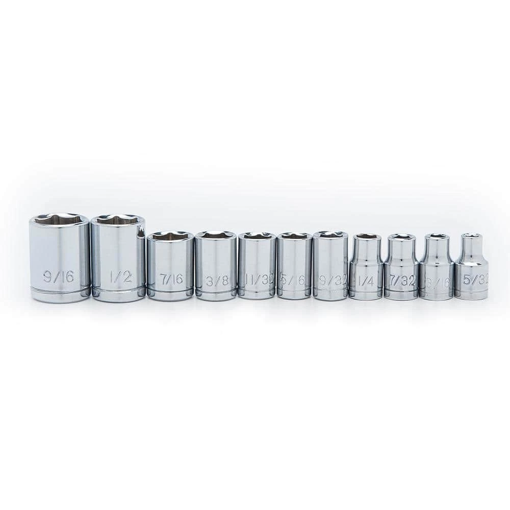 The Husky 46-Piece Stubby Ratchet Set includes 22 sockets and 20 screwdriver bits to hand various jobs around the house. The Stubby Ratchet features a 1/4 in. drive tang on 1 side and a 3/8 in. drive tang on the opposite side giving you the versatility to use both drive sizes on 1 ratchet. The co-molded grips on the ratchet, ratcheting bit driver and the adjustable wrench provide a strong and comfortable grip to get the job done. 72-tooth stubby ratchet needs only a 5 degree swing arc to turn a fastener, allowing you to work in tight places. The Husky magnetic bit driver included works with all standard 1/4 in. drive bits. Set is kept organized and travel-ready in the plastic storage case that is marked with each size.