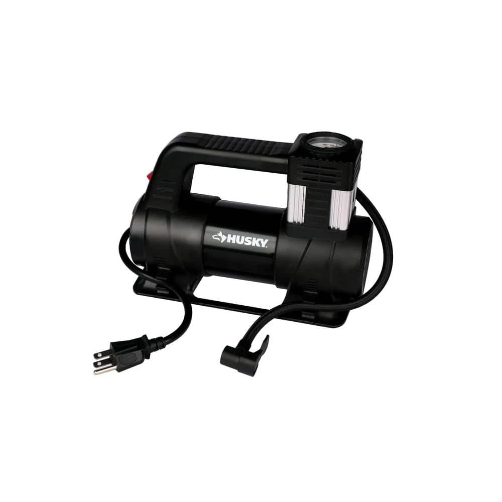 The Husky 120-Volt Inflator inflates vehicle tires, bicycle tires, air mattresses and sports equipment, its direct-drive motor is powerful, quiet and fast, the inflator features an analog pressure gauge with backlight for easy viewing with a maximum pressure detection of 120 PSI, it plugs into a standard household electrical outlet and is equipped with a large power button for no-fuss operation.