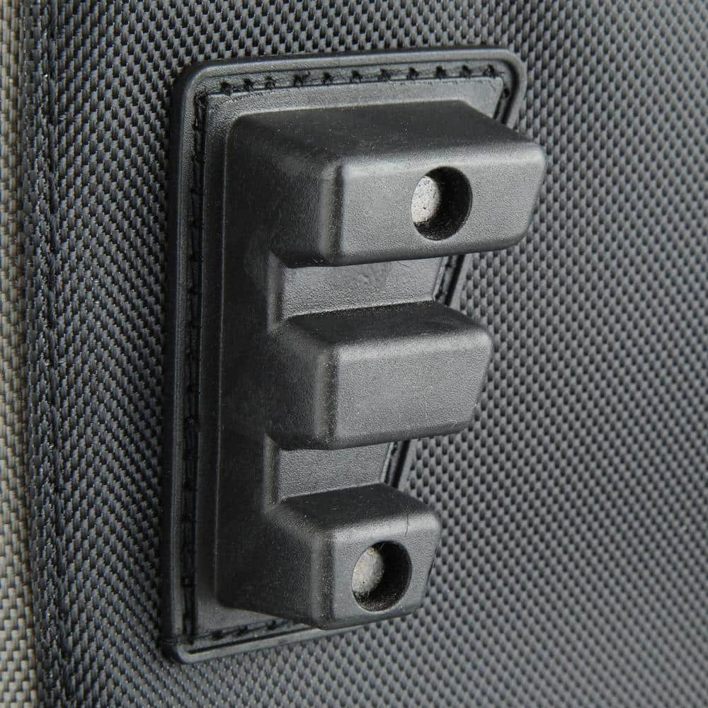 Keep your tools organized and handy with this Husky 16 in. Large Mouth Bag. It features a main compartment with dual lockable security zippers and a hard-sided pocket on the exterior. It also has 11 additional exterior storage pockets, a glove/rag clip for air-dry storage, an easy-access tape clip and a lockable security zipper. This bag will last you over time with a heavy-duty 1680D fabric construction with full reinforced edges. There are five feet on the base and the inside has 25 pockets and elastic straps to hold tools of all sizes.
