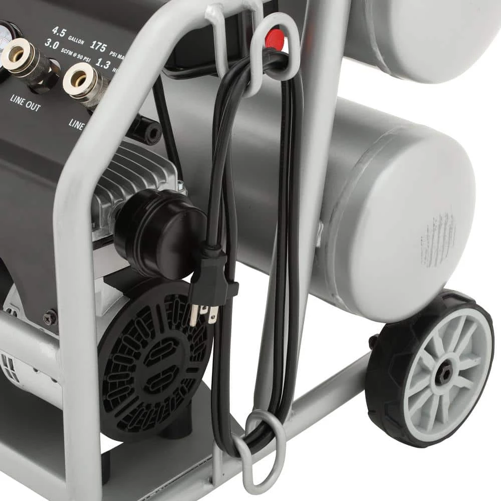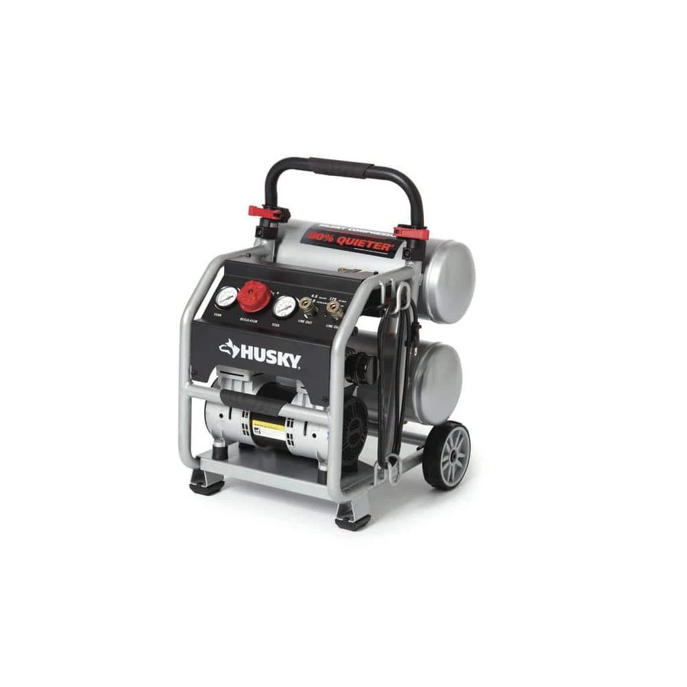 Do the work without the noise with the Husky 4.5 Gal. Portable Electric Air Compressor. This quiet compressor operates at less than 65 dBA, but delivers 3.0 SCFM at 90 PSI. Ideal for household inflation jobs such as bike tires, car tires, air mattresses, sports balls and pool toys. It’s also perfect for tools such as brad and finish nailers. A height adjustable handle and rubber wheels give this compressor easy mobility. Two quick couplers allow 2 tools to work simultaneously.