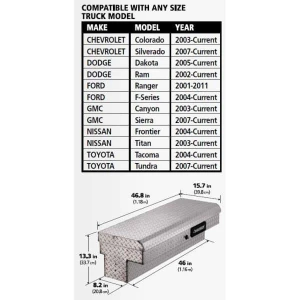 The Husky Aluminum Low Side Box for full size and compact trucks provides protection for your tools and equipment from the elements and break-ins. The low side box is the perfect companion for the Husky Aluminum Saddle Box when more protected storage is needed. The fully-welded aluminum construction and rubber weather seal protect your items from inclement weather. The easy-to-use, lockable push button and fully welded loop striker help resist break-ins. Included with the box is a sliding plastic tray that allows you to organize and easily access your small tools and hardware. Included as well is the mounting kit that mounts to the truck bed lip and floor.