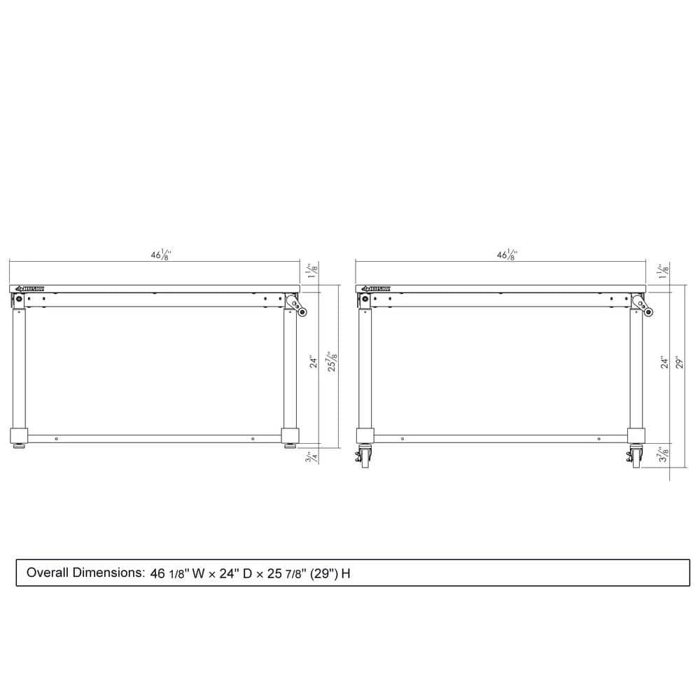 Elevate your work experience with the Husky 46 in. Adjustable-Height Work Table. This multi-functional work station features a manual crank that can raise and lower the work surface height. The 1.2 in. thick, solid wood top is rugged and beautiful and there is plenty of space on the 46 in. W x 24 in. D work surface. The workbench can be assembled with either the four, 3 in. x 2 in. polypropylene casters for mobility or attach the 4 leveling feet for use as a stationary table or desk. This work table has plenty of uses around the home, office, hobby room or garage. It is designed with a 300 lbs. load capacity and an overhang so that you can easily attach your vise grips or cl-Amps while working on a project. This 46 in. Husky Work Table’s contemporary, adjustable-height feature allows you to have the flexibility to sit or stand while working. Research suggests that there are health benefits to alternating between standing and sitting throughout the day because it both decreases body discomfort and increases blood flow. The ergonomic design could also reduce eye and back strain and boost your productivity. The crossbar support can be installed in 2 different locations, depending on your preference. Install the support at the center of the table for an open, 2-sided work area. Or install it along the back of the legs to allow you the versatility of stowing your tool storage and rolling cabinets underneath to further organize your work space.