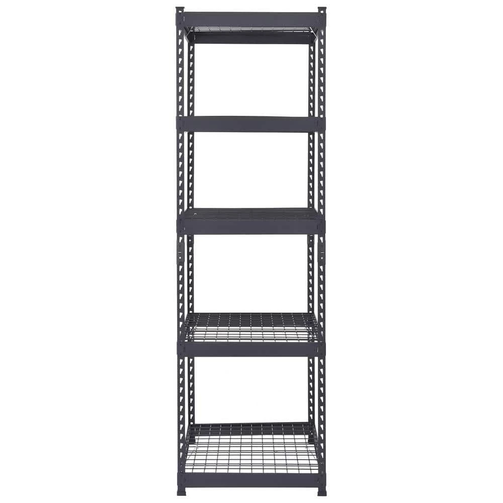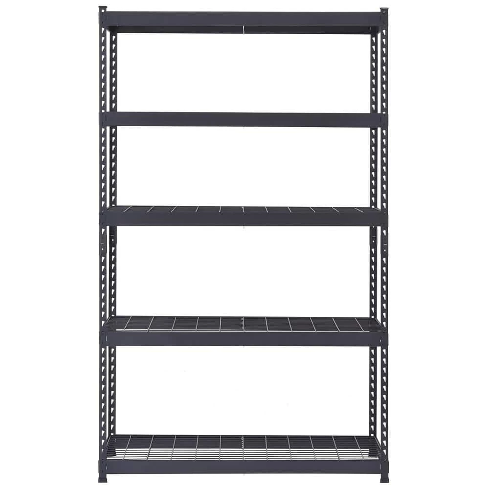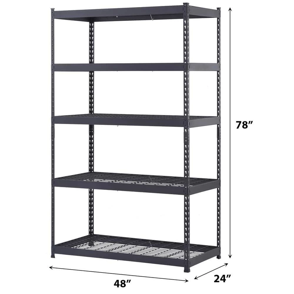 This Husky 5-shelf heavy-duty steel shelving unit can be assembled vertically as a 78 in. high unit or as two individual 39 in. high units. You can adjust this multipurpose unit’s shelves in 1.5 in. increments to fit any storage need. It features a boltless design for easy assembly and is constructed of heavy duty steel for strength and rigidity. The durable black wire shelves provide better visibility, air flow and less dust accumulation.
