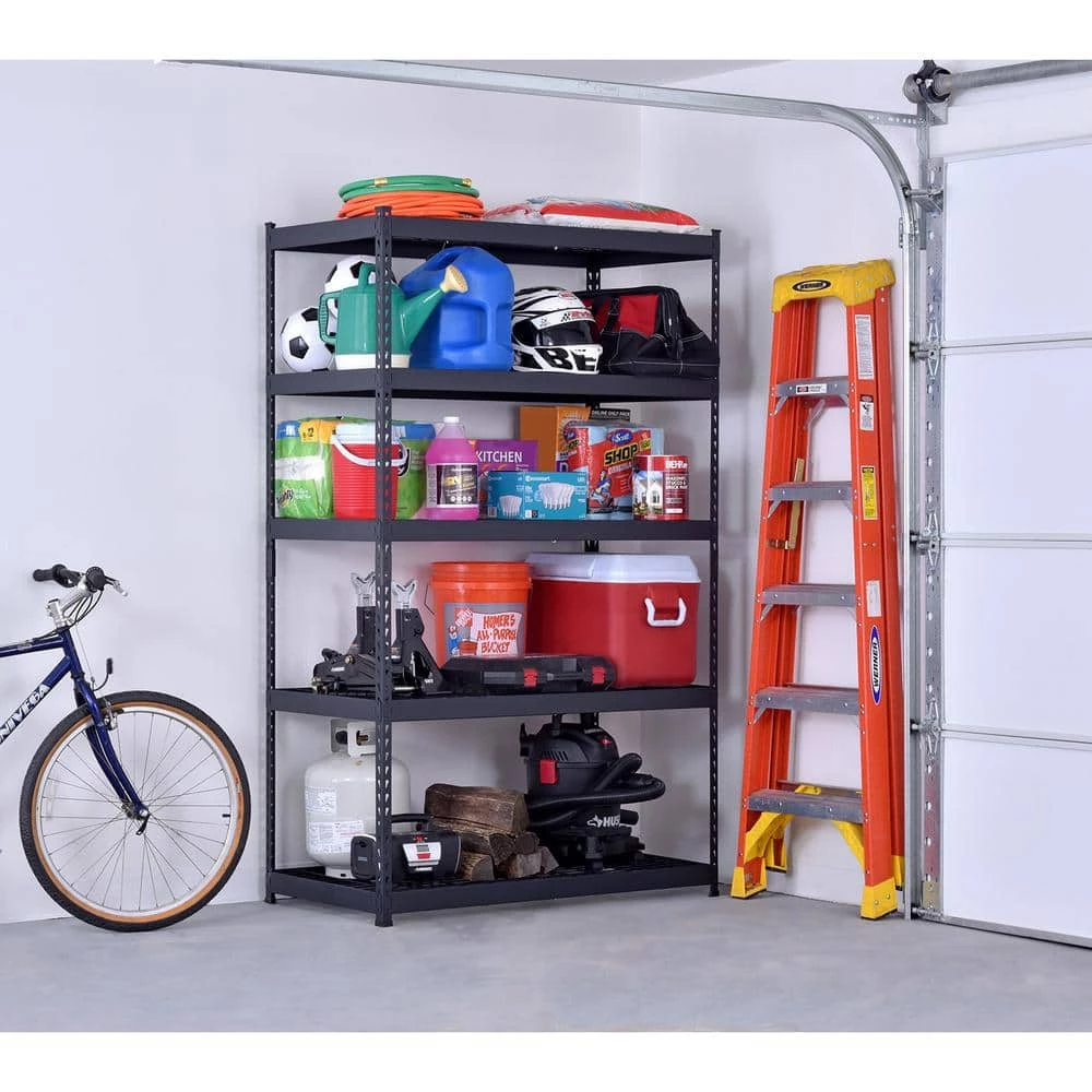 - 5 adjustable shelves that provide ample storage for bins, boxes, tools, food containers and more