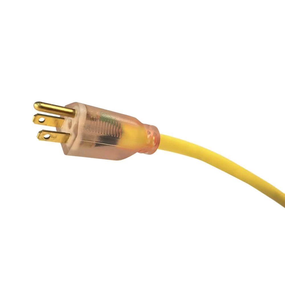 This 12/3 50 ft. extension cord has a lighted triple tap receptacle for multi-use. It is UL rated for outdoor use. The high visibility yellow jacket is for added safety.