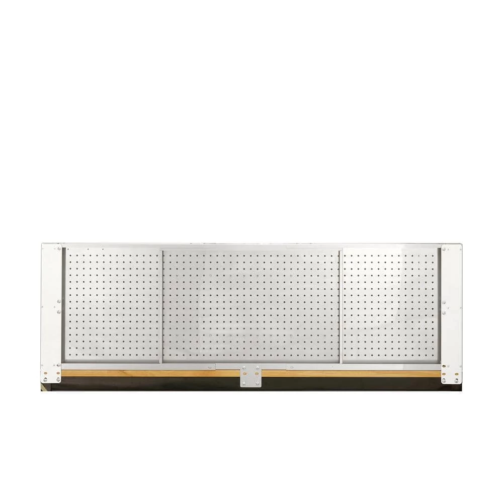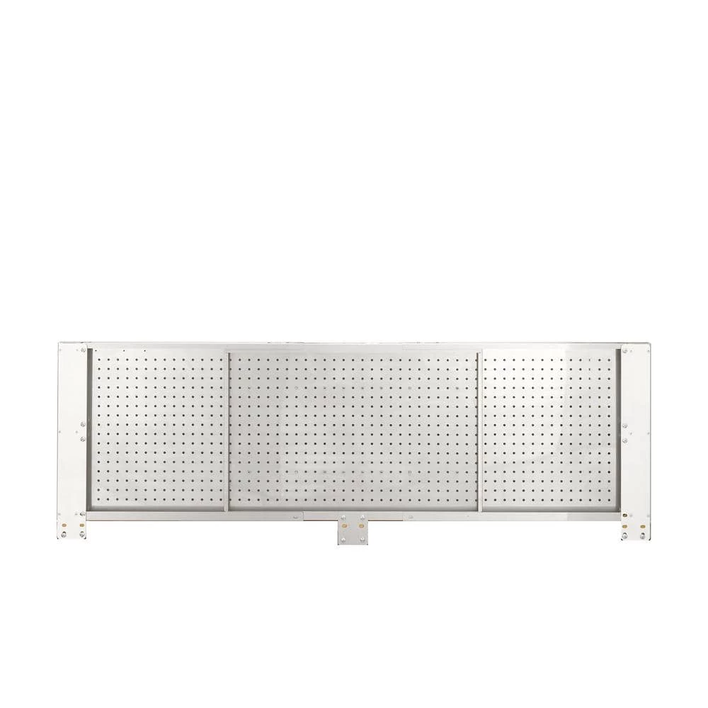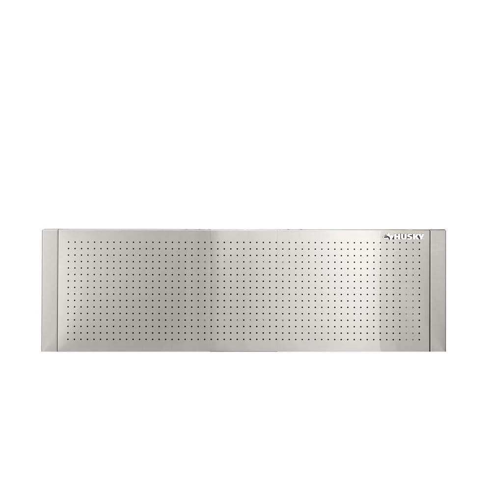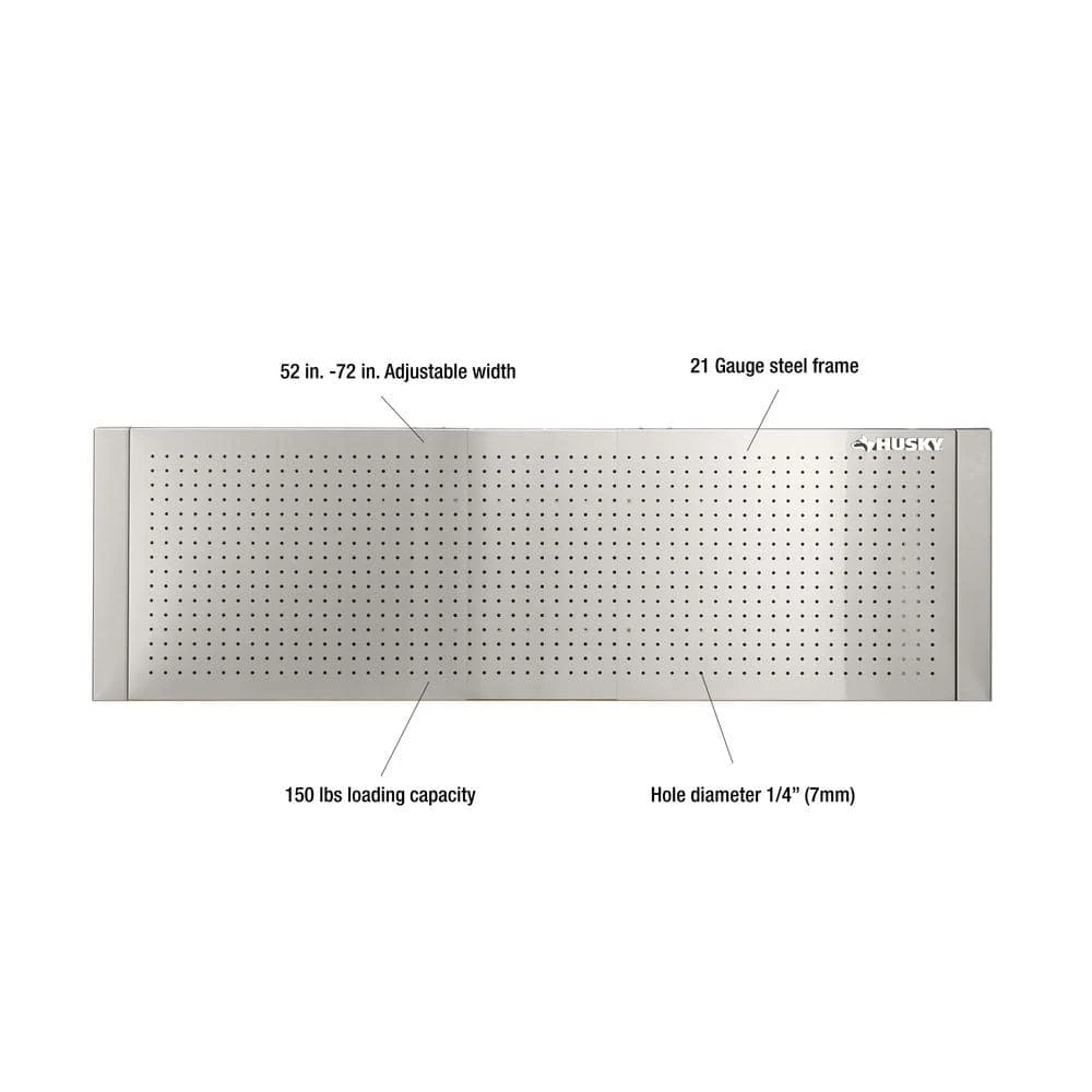 The Husky Stainless Steel Pegboard Back Wall adjust from 52 in. W to 72 in. W making this the perfect accessory to select Husky Mobile workbenches. It adds vertical storage to hang a variety of items, including your heavier power tools. The heavy-duty, 21-Gauge steel will support up to 150 lbs. and is much stronger than conventional pegboard. The peg holes will accommodate most 1/4 in. and 1/8 in. peg hooks, which are positioned 1 in. on center.