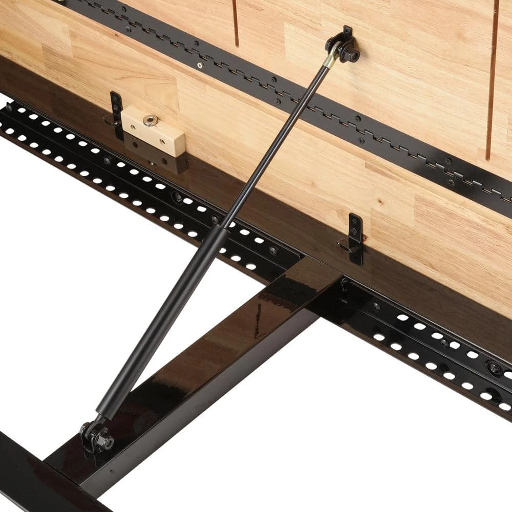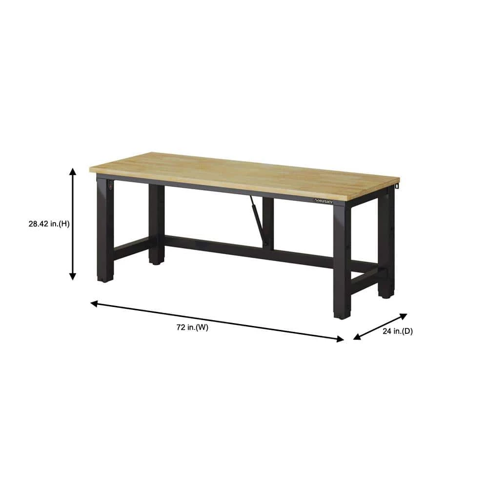 Get more done with this Husky folding workbench. Perfect for your garage or workshop, the height adjusts from 28 to 42 in. For fast set-up and storage, it features a handy folding mechanism. The solid wood top and sturdy steel frame ensure lasting use.