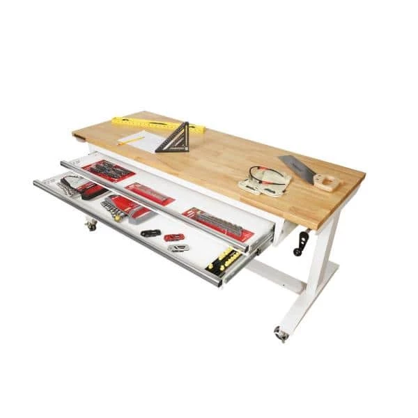 Elevate your work experience with the Husky 62 in. Adjustable-Height Work Table with 2-Drawers. This multi-functional work station features a manual crank that can raise and lower the work surface. The 1.2 in. T, solid wood top is rugged and beautiful and there is plenty of space on the 62 in. W x 24 in. D work surface. The workbench can be assembled with either the four 3 in. x 2 in. polypropylene casters for mobility or attach the 4 leveling feet for use as a stationary table or desk. This work table has plenty of uses around the home, office, hobby room or garage. It is designed with a 300 lbs. weight capacity and an overhang so that you can easily attach your vise grips or cl-Amps while working on a project. This 62 in. Husky Work Table’s contemporary, adjustable-height feature allows you to have the flexibility to sit or stand while working. Research suggests that there are health benefits to alternating between standing and sitting throughout the day because it both decreases body discomfort and increases blood flow. The ergonomic design could also reduce eye and back strain and boost your productivity. The crossbar support can be installed in 2 different locations, depending on your preference. Install the support at the center of the table for an open, 2-sided work area. Or install it along the back of the legs to allow you the versatility of stowing your tool storage and rolling cabinets underneath to further organize your work space.
