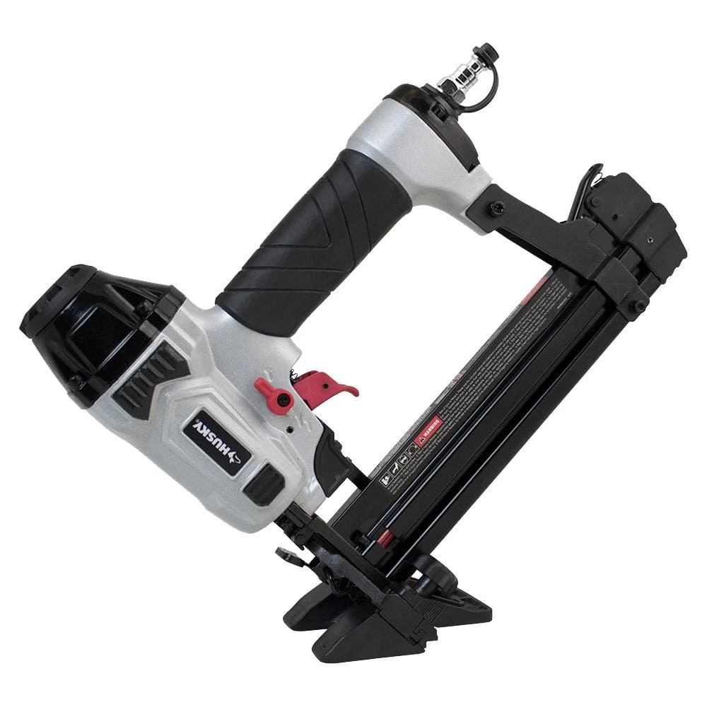 The Husky DPFBC940 Pneumatic 4-in-1 18-Gauge 1-5/8 in. Mini Flooring Nailer and Stapler combines a flooring nailer and stapler with a brad nailer and narrow crown stapler. This exceptionally versatile air powered combo tool is designed to install 3/8 in. to 5/8 in. engineered or solid hardwood flooring with the pre-assembled 45-Degree flooring attachment. Switch out the nose piece fast and easy, and convert this multi-purpose tool into a brad nailer and stapler, allowing you to lay your flooring in hard to reach areas against a wall or in tight corners. You can also then put in base boards, crown moulding, chair rails and other decorative trim. This 4-in-1 nail gun and stapler is compatible with 18 gauge brad nails from 5/8 in. to 1-5/8 in., and 18 gauge 1/4 in. narrow crown staples from 1/2 in. to 1-5/8 in. A one piece drive blade of hardened steel combined with an anodized aluminum cylinder and magazine result in a durable and lightweight tool. The ergonomically engineered body and comfort grip handle make this tool easy to use for long shifts. Featuring a quick jam release, tool-free depth adjust, reload indicator, and an easily adjustable flooring foot plate, this combo tool will increase productivity and reduce unnecessary downtime at the home or job site. The Pneumatic 4-in-1 18-Gauge 1-5/8 in. Mini Flooring Nailer and Stapler will save DIYers and construction contractors time and money, and is covered by Husky’s 2 Year Limited Warranty.