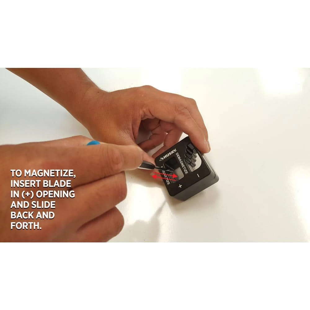 - Magnetize by sliding the tool through the plus opening