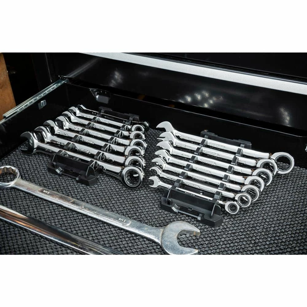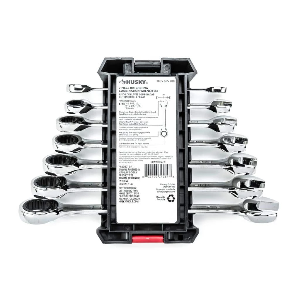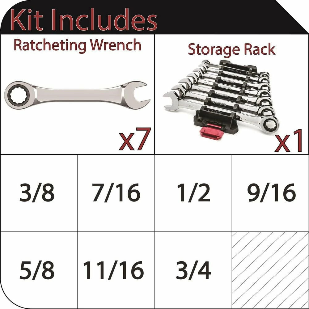 - Set includes 7 ratcheting wrenches covering sizes 3/8 in., 7/16 in., 1/2 in., 9/16 in., 5/8 in., 11/16 in., 3/4 in.
