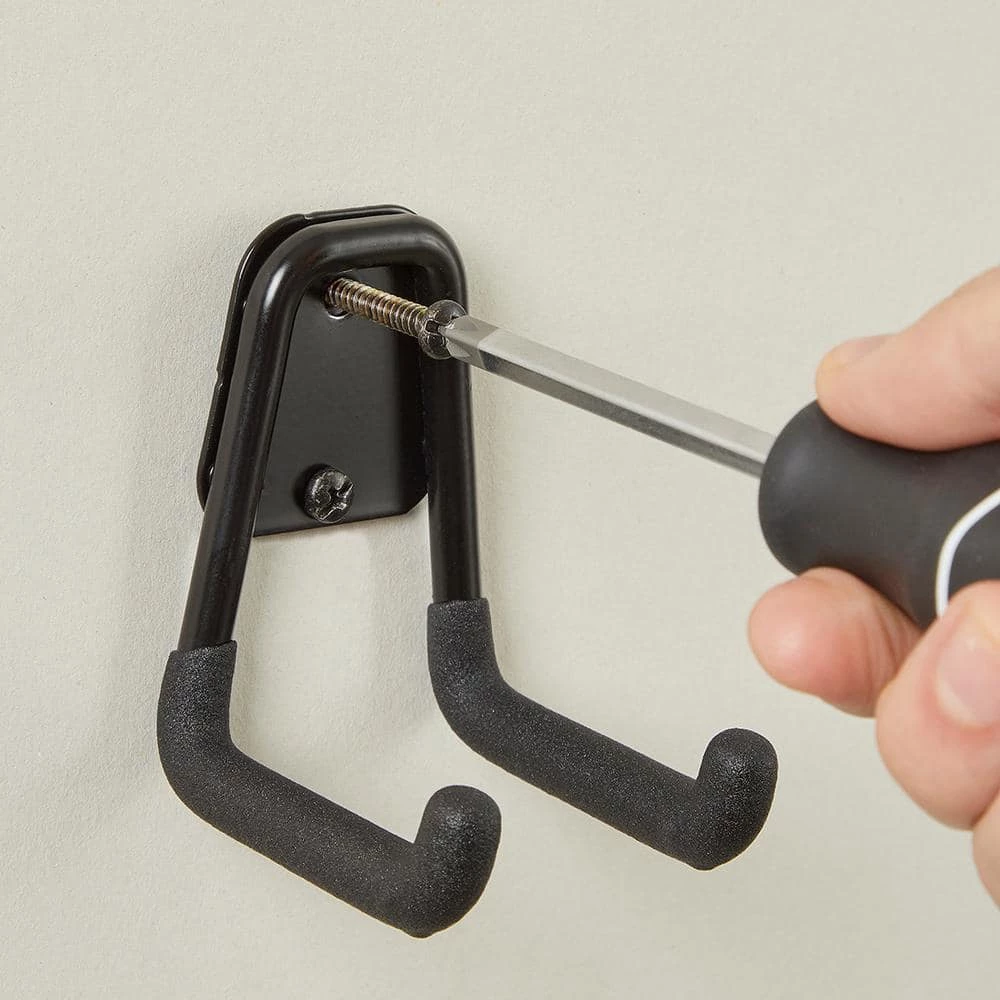 The Husky 45 lbs. Small Steel U-Hook features a 2-3/4 in. projection and a 2-3/8 in. opening. The hook is constructed of durable steel and holds up to 45 lbs. with wood stud installation or up to 20 lbs. with drywall installation. Multi-use hook is good for storing many types of tools or other items. Comes with heavy-duty anchors for drywall installation. Stud installation recommended for maximum security. Black finish with black protective vinyl coating is a sleek and modern looking garage storage and organization solution.